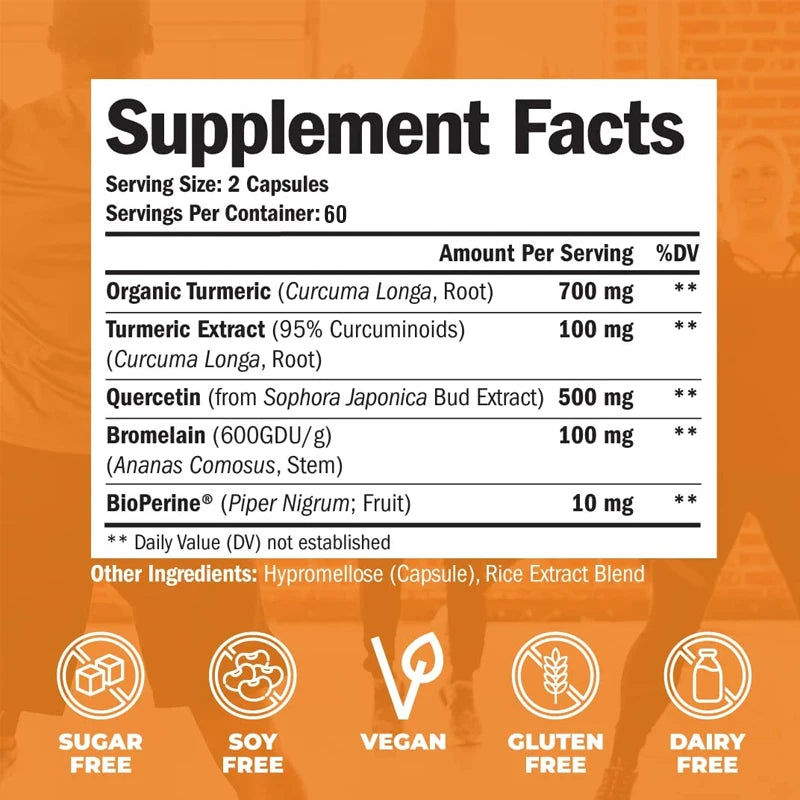 Premium Turmeric Powder Curcumin Capsules - Contains Quercetin, Bromelain and Black Pepper To Promote Joint and Bone Health